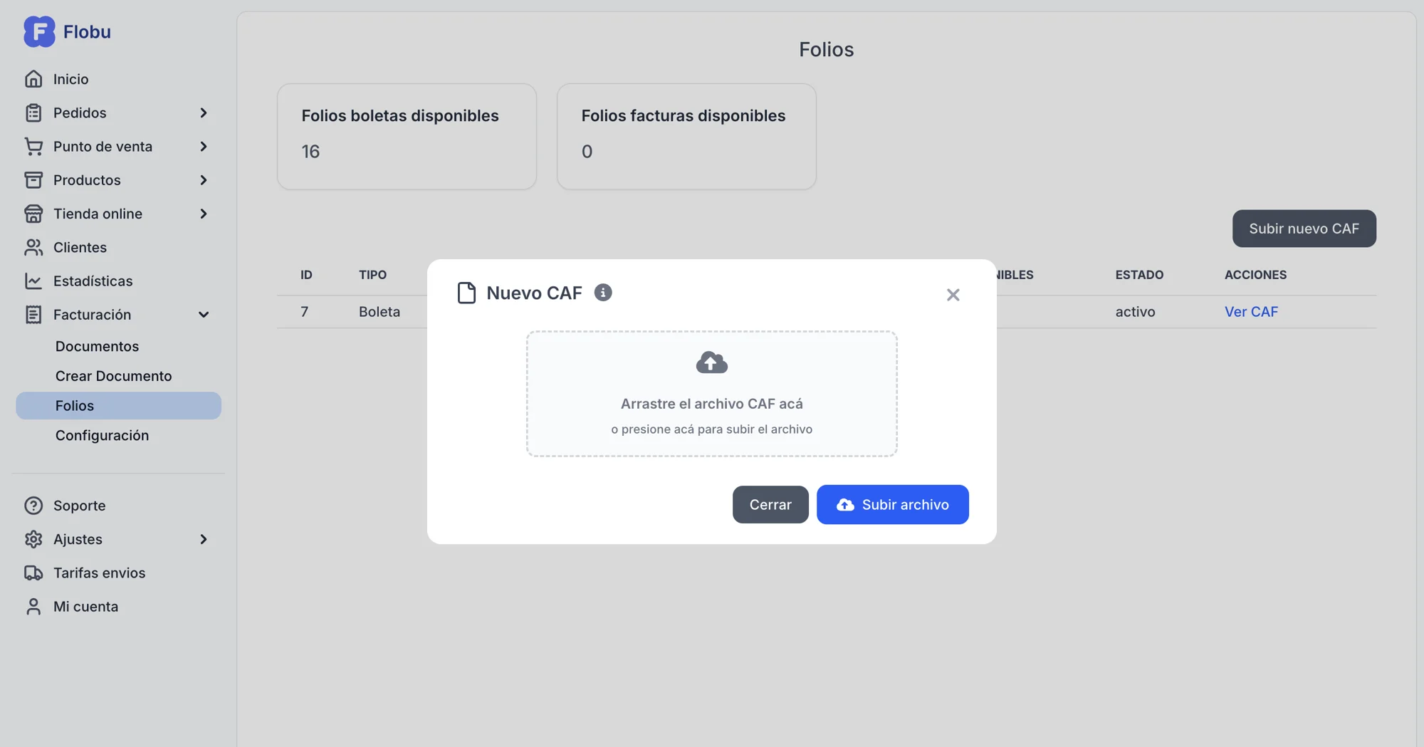 En tu panel Flobu, ve a Facturación > Folios.