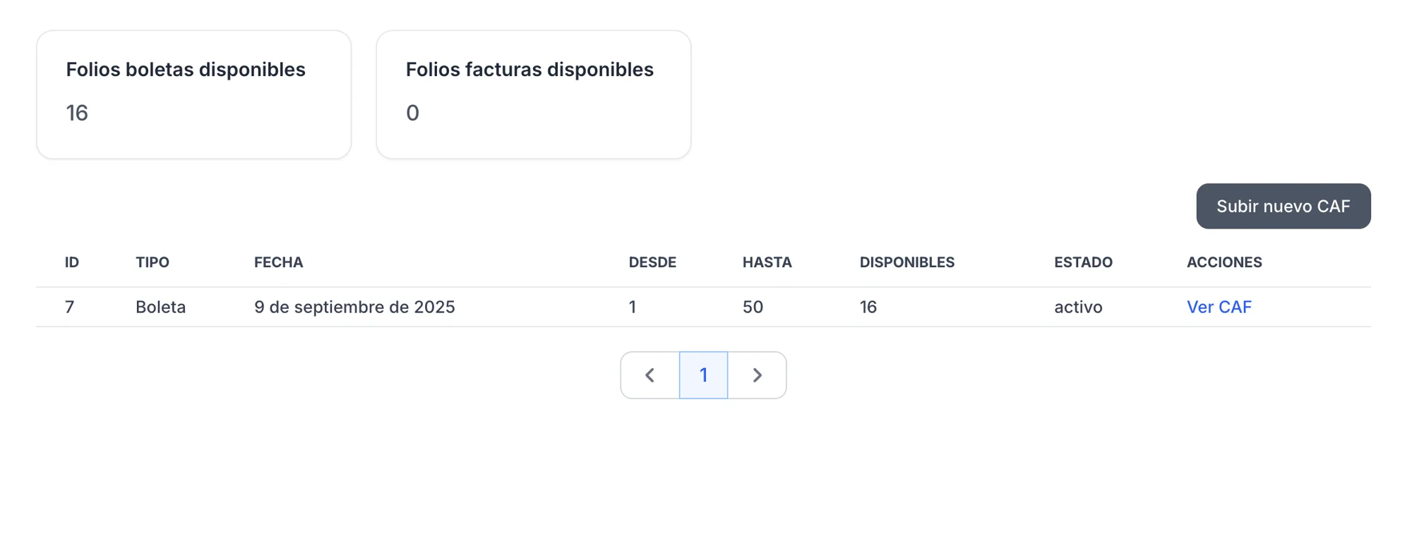 Verás una tabla con tus folios actuales. Haz clic en el botón "Subir nuevo CAF".