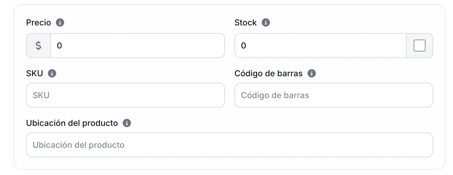 Al no agregar "Atributos" (como talla o color), Flobu entiende automáticamente que este es un producto simple y te mostrará los campos de venta directa.
