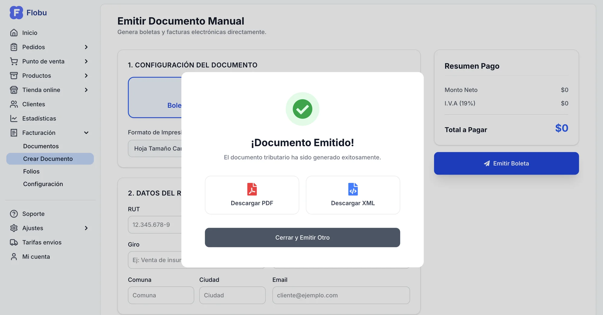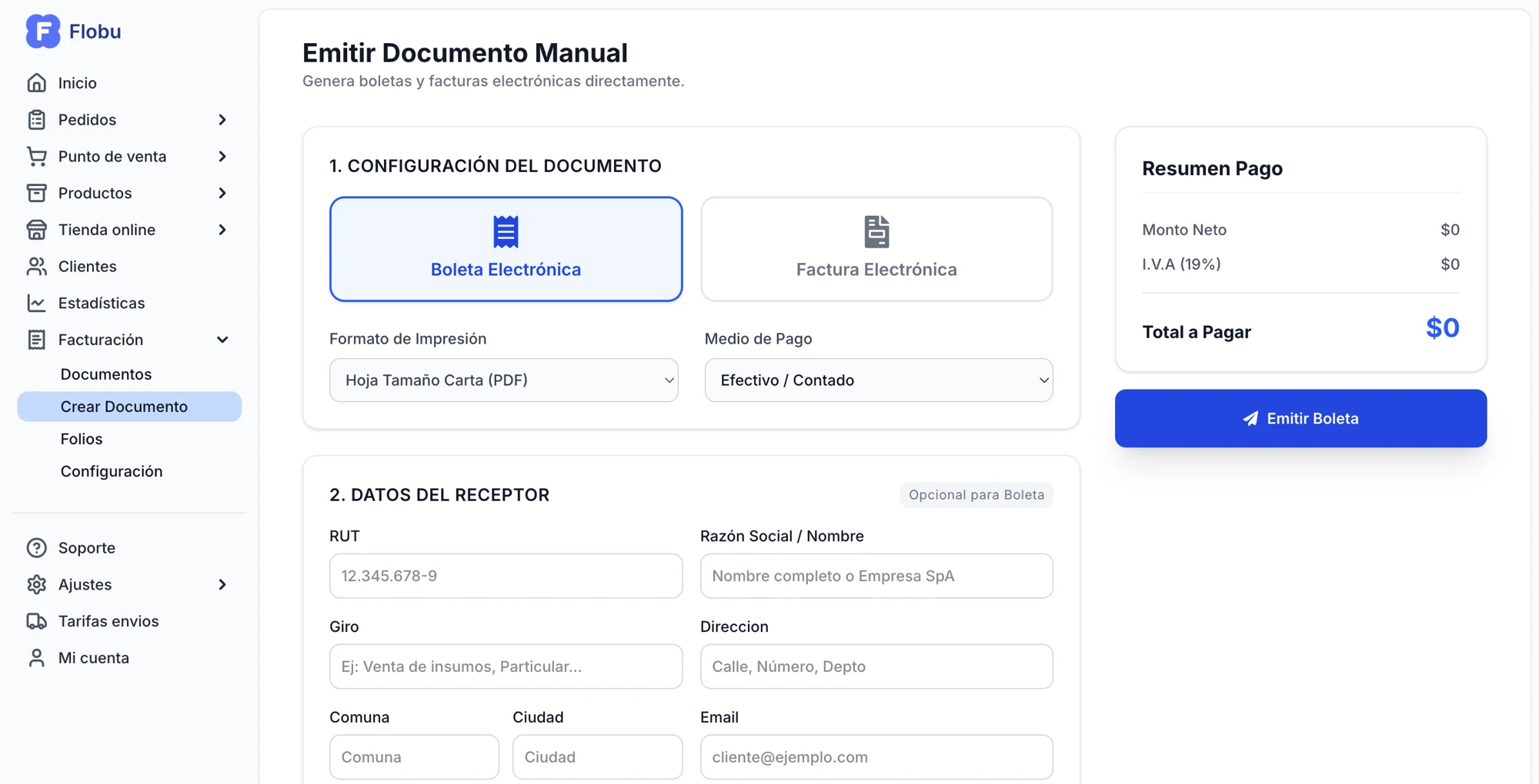 Aunque Flobu genera boletas automáticamente cuando vendes online, a veces necesitas emitir una factura especial o una boleta manual.