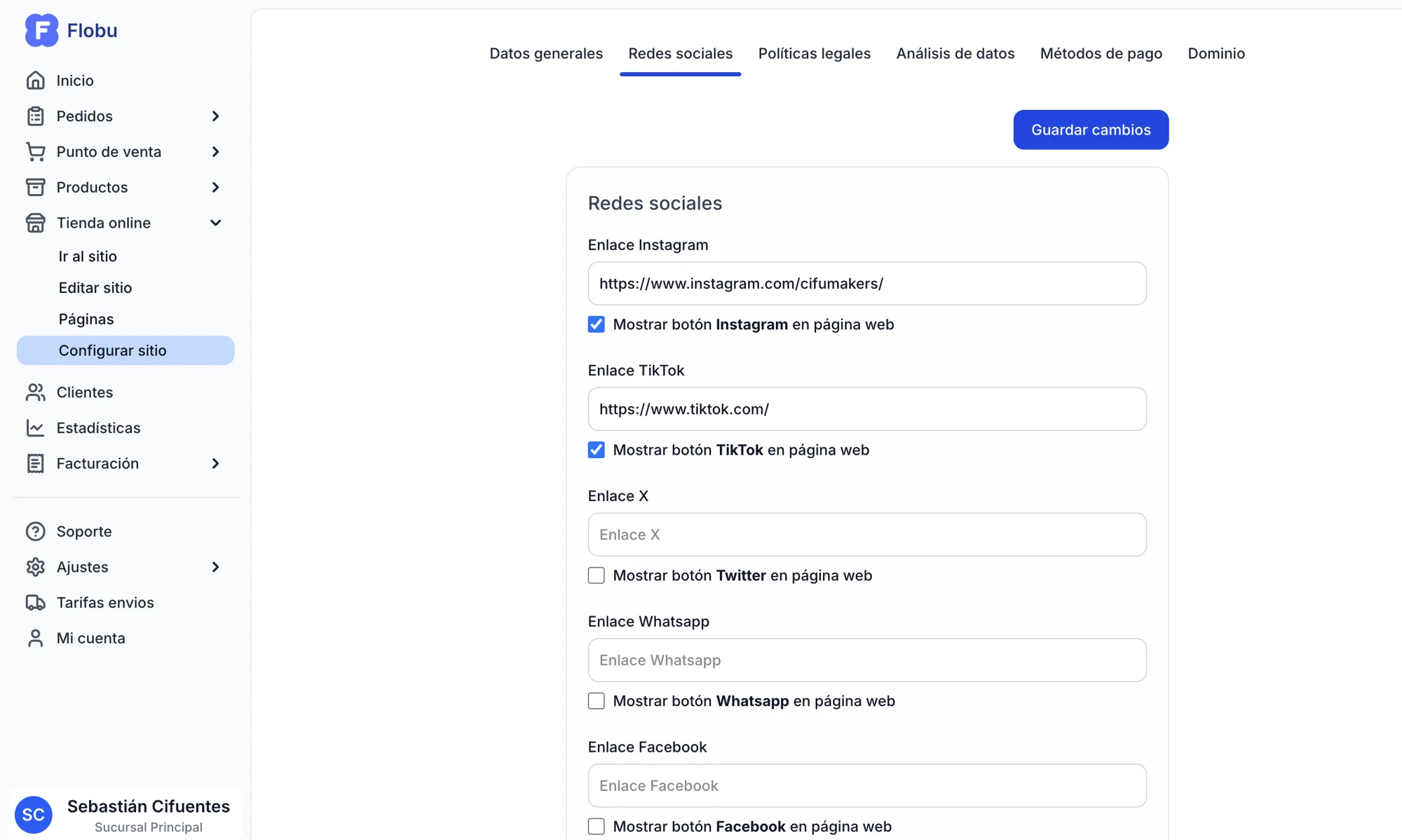 3. Activar los Botones Asegúrate de marcar la casilla o interruptor que dice "Mostrar botón en página web" para cada red social que quieras hacer visible.