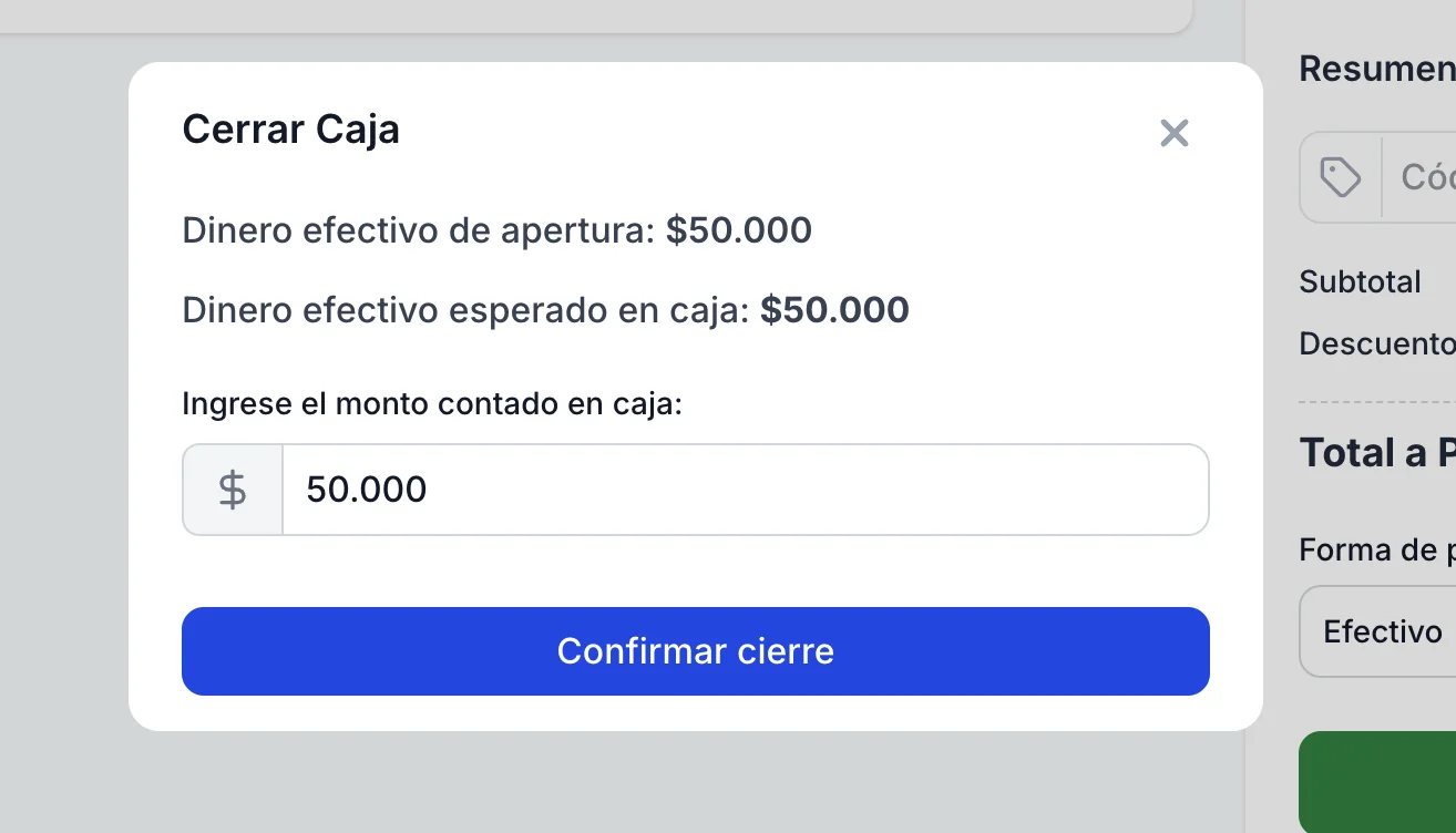 Al finalizar el día o el turno, debes cerrar la caja para que el sistema calcule las ventas y verifique si cuadra el dinero.