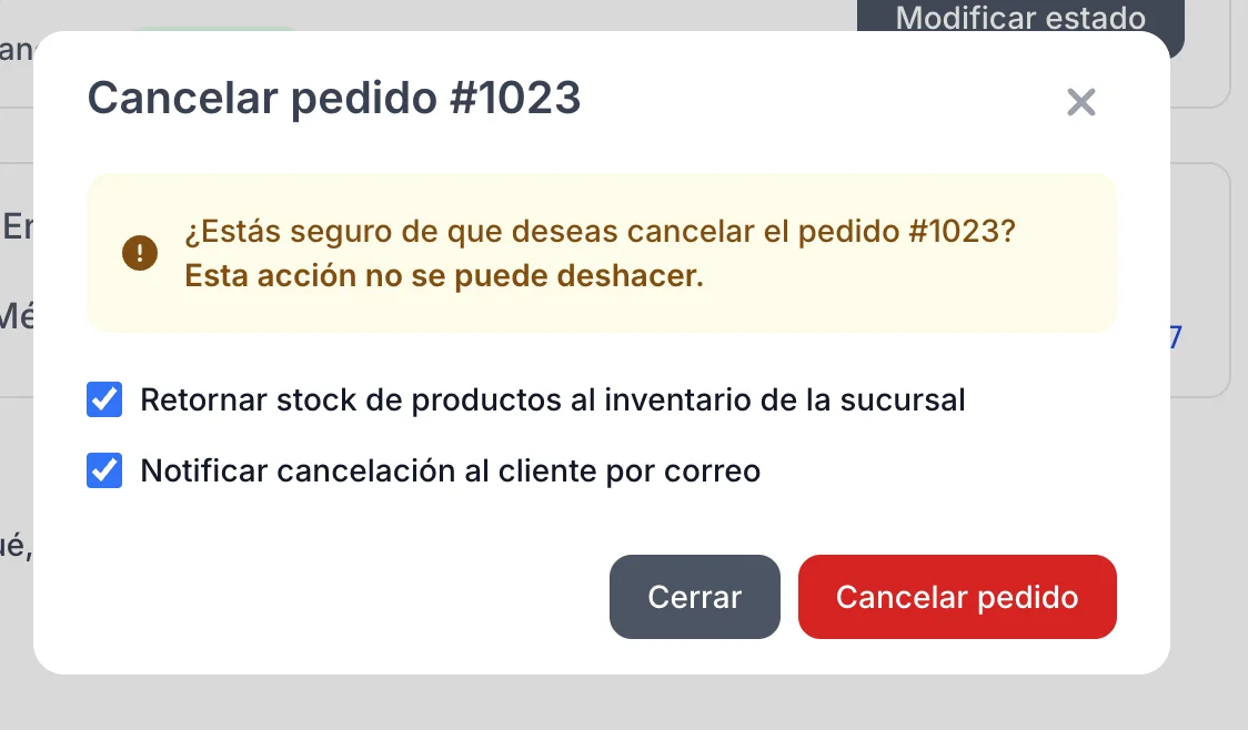 El estado del pedido cambiará inmediatamente a "Cancelado" (etiqueta gris).