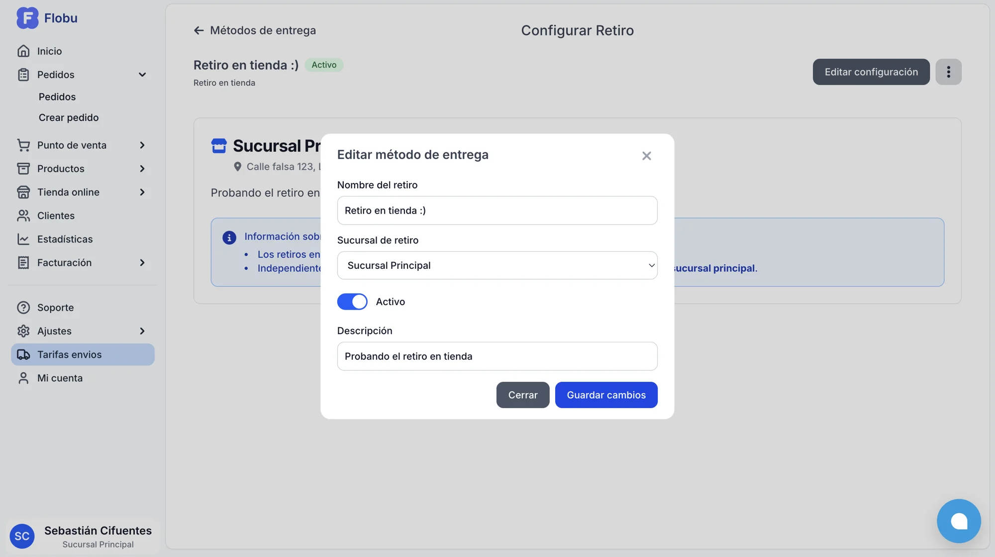 Haz clic sobre el método "Retiro en Tienda" para editarlo.