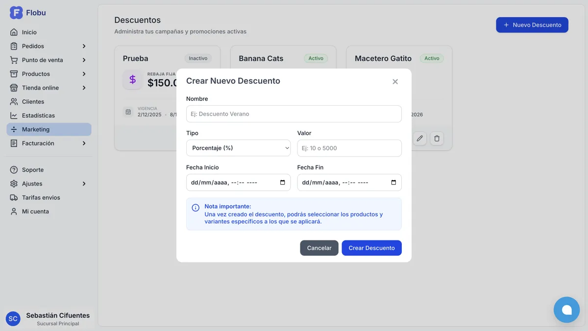 En Flobu, ahora puedes crear incentivos personalizados para tus clientes. Los descuentos se gestionan desde un panel centralizado que te permite controlar qué se rebaja y por cuánto tiempo.