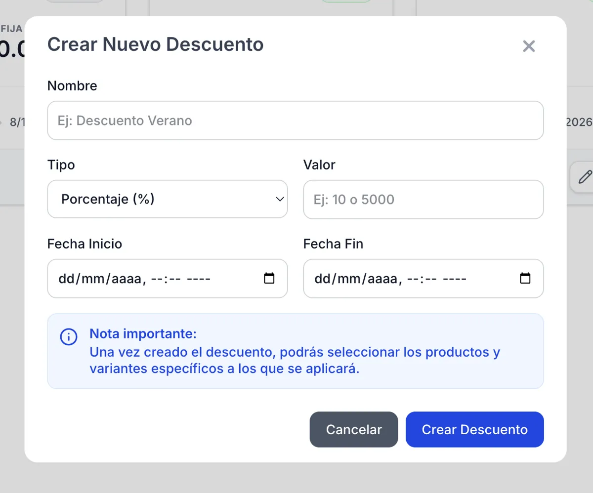 Haz clic en el botón "Crear Descuento" (o el icono de "+"). Se abrirá una ventana emergente con los siguientes campos: