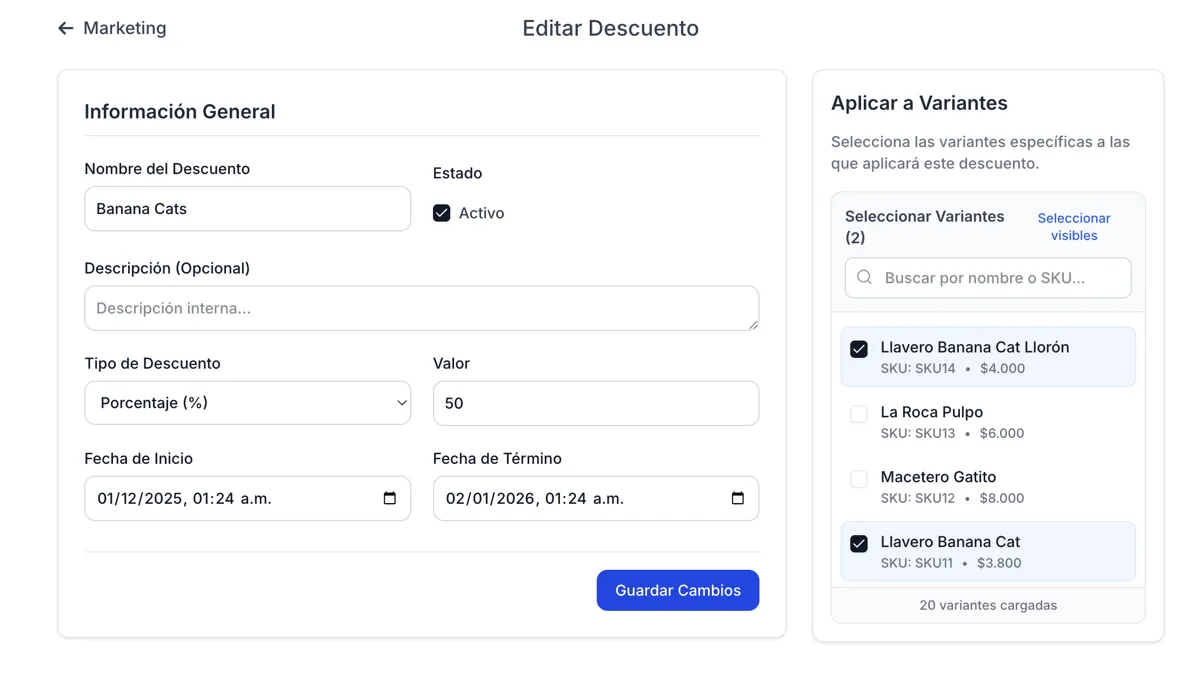 Si un producto tiene variantes (ej: tallas o colores), puedes elegir aplicar el descuento solo a una de ellas (ej: solo a la Polera Roja Talla L) o a todas.