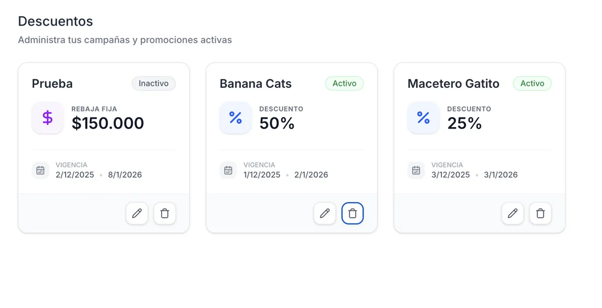 Estado: Asegúrate de que el interruptor esté en "Activo" para que el descuento empiece a funcionar.
