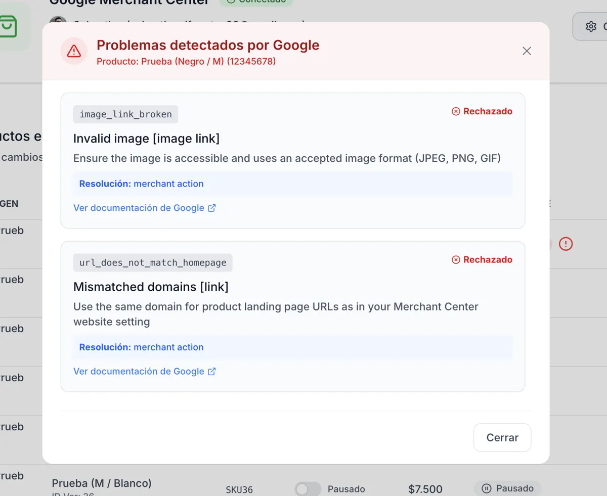 Corrige los datos en la ficha del producto de Flobu y el sistema volverá a intentar la sincronización automáticamente en el próximo ciclo.